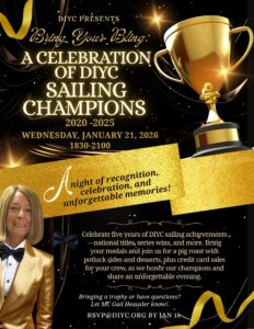 Celebrate five years of DIYC sailing achievements—national titles, series wins, and more. Bring your medals and join us for a pig roast with potluck sides and desserts, plus credit card sales for your crew, as we honor our champions and share an unforgettable evening.
