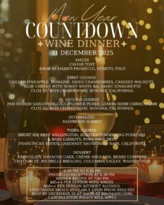 The evening begins with a Prosecco reception from 6:30–7:00 pm, followed by a four-course dinner featuring three expertly paired wines. Dinner will be served from 7:00–9:30 pm, giving you plenty of time to enjoy a delicious meal and still make it home—or out—to celebrate as the clock strikes midnight.